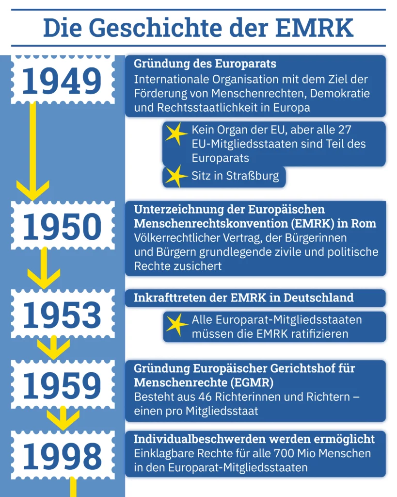 Die EMRK ist ein internationaler Vertrag des Europarats und garantiert zentrale Freiheits- und Grundrechte für die Bürgerinnen und Bürger seiner 46 Mitgliedstaaten. Sie wurde 1950 vom Europarat erarbeitet, der nur ein Jahr zuvor gegründet wurde. In Deutschland trat die Menschenrechtskonvention 1953 in Kraft.