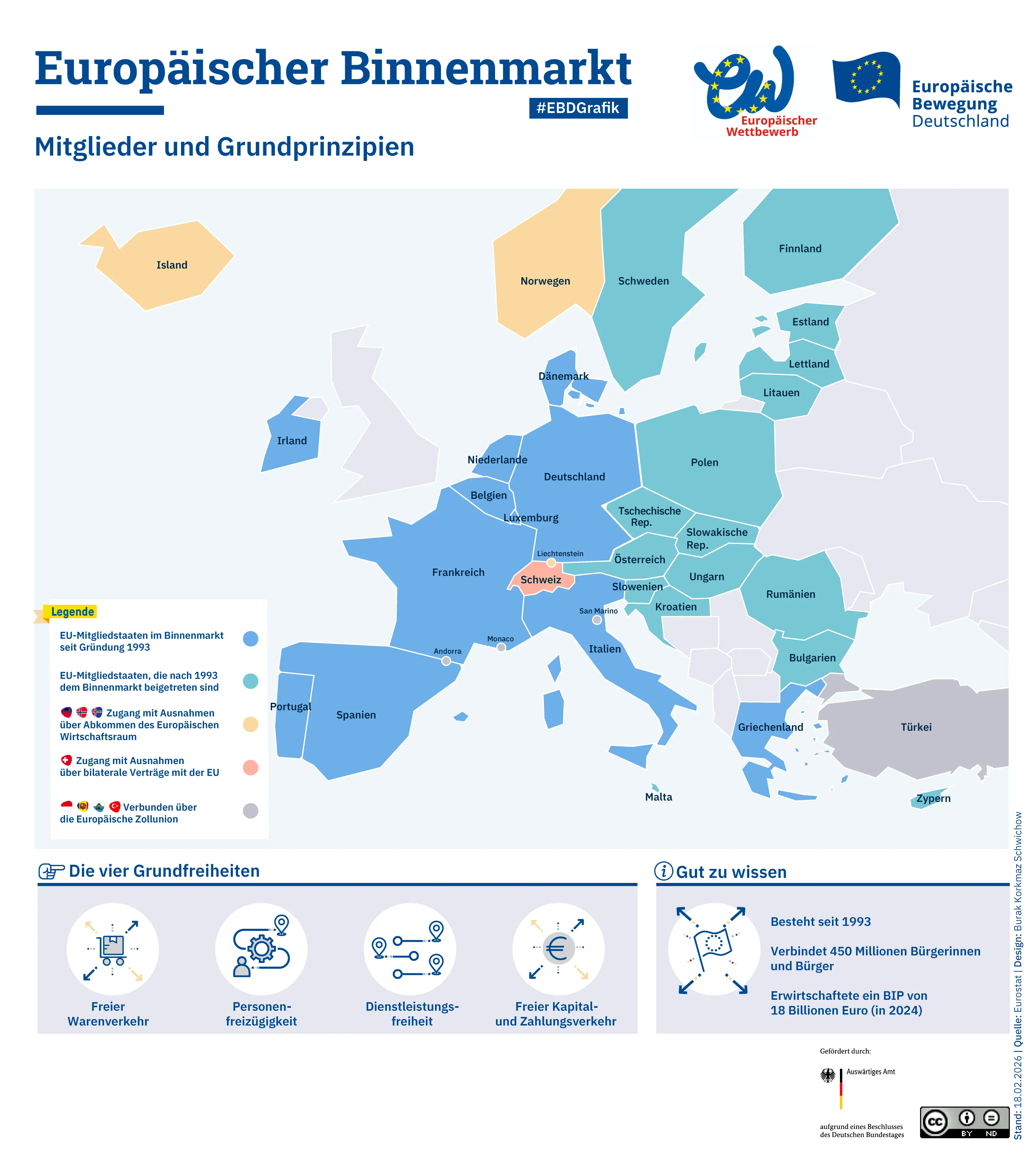 Seit 1993 verbindet der Europäische Binnenmarkt rund 450 Millionen Menschen und bildet das wirtschaftliche Fundament der Europäischen Union. Unsere EBD-Grafik des Monats zeigt, welche Staaten am Binnenmarkt teilnehmen, über welche Modelle sie angebunden sind und auf welchen vier Grundfreiheiten er beruht.