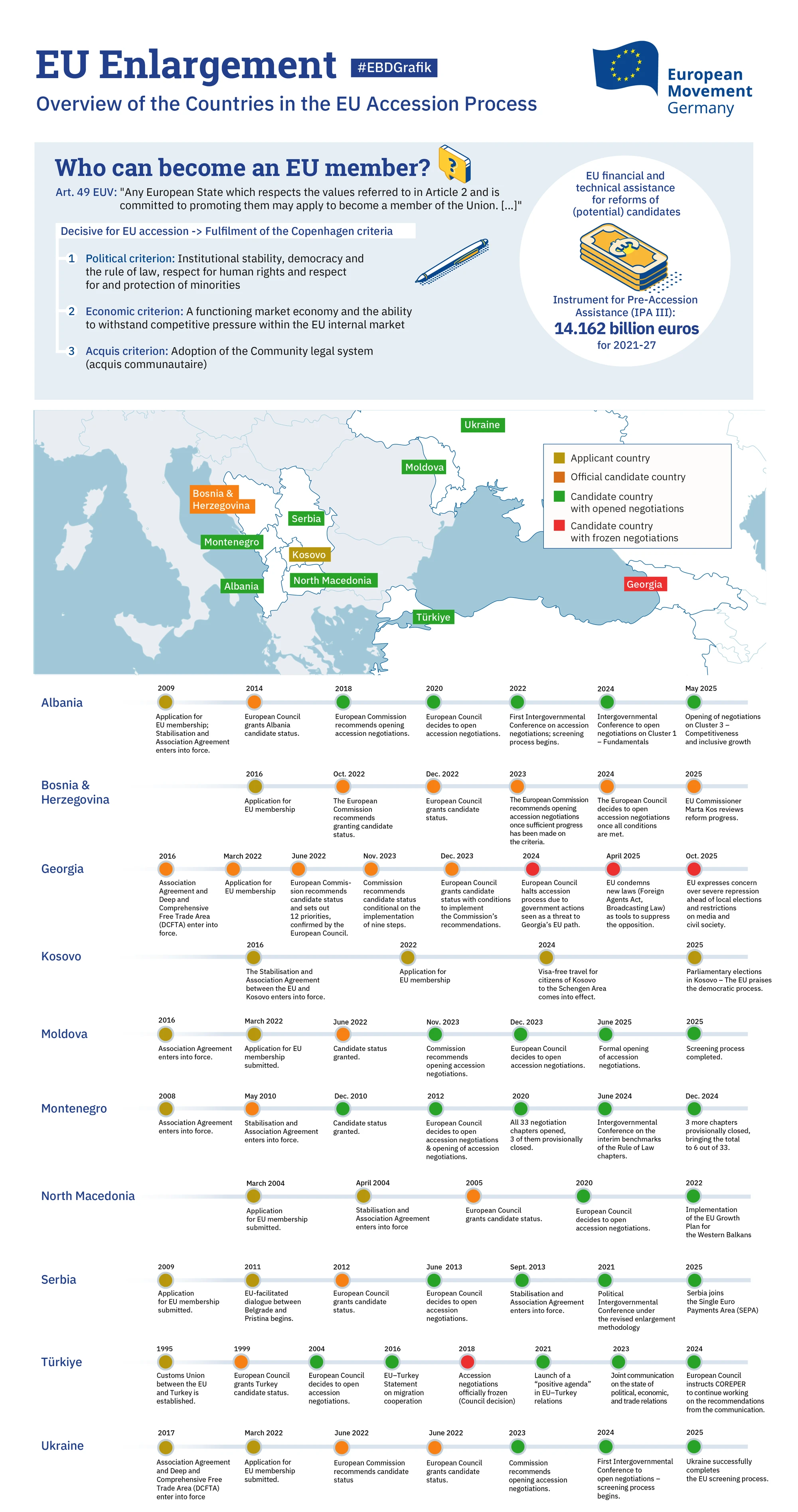 When the European Commission presents its Enlargement Package on 29 October, the discussion will not only concern the famous “homework” of the ten applicant and candidate countries. Our #EBDGraphic provides an up-to-date overview. Yet it is also about a serious debate: how can the EU allow majority decisions already during the ongoing accession process and create tangible interim steps along the long road to membership? And how seriously are we addressing our own reform tasks within the Union?
