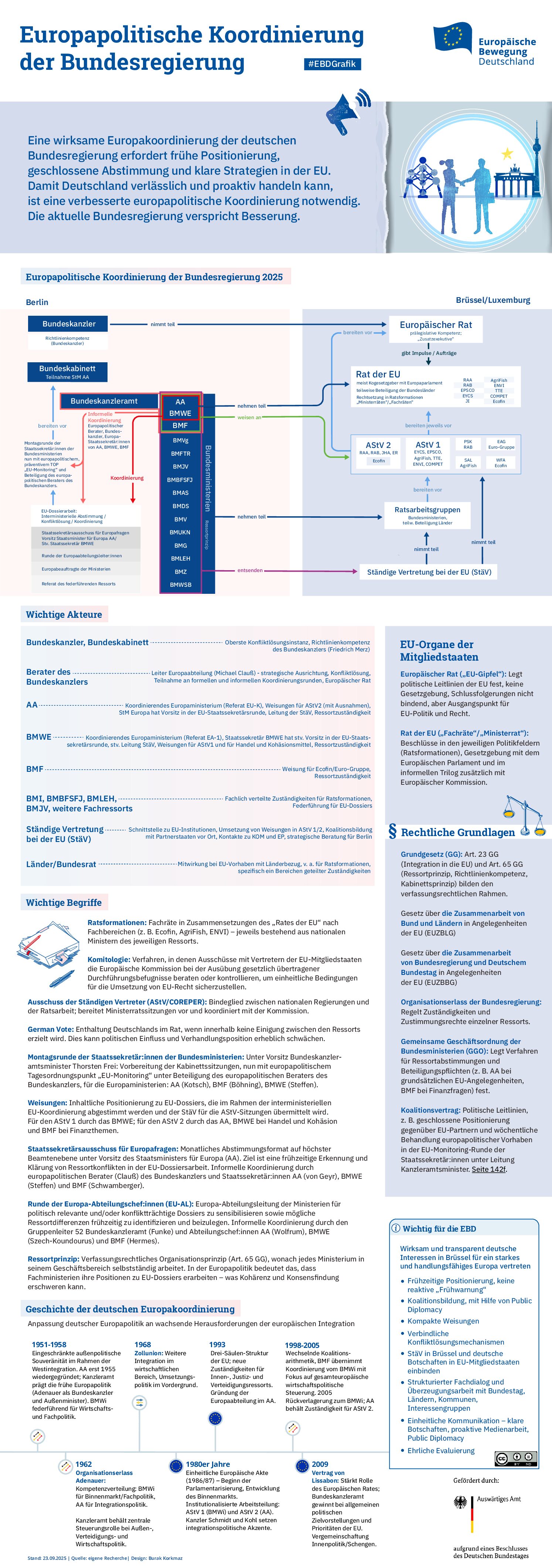 EU-in-BRIEF ist die Fachpublikation der Europäischen Bewegung Deutschland (EBD) zur deutschen Europapolitik. Das Format greift aktuelle Themen und Diskussionen der deutschen Europapolitik auf, gibt aber auch Ausblick auf kommende Herausforderungen. Die Publikation ist damit eine nützliche Quelle für Analysen und Hintergrundinformationen und bietet ein Forum für Expertenmeinungen aus den Mitgliedsorganisationen des EBD-Netzwerks. EU-in-BRIEF kann auch als elektronische Ressource in der Deutschen Nationalbibliothek abgerufen werden.